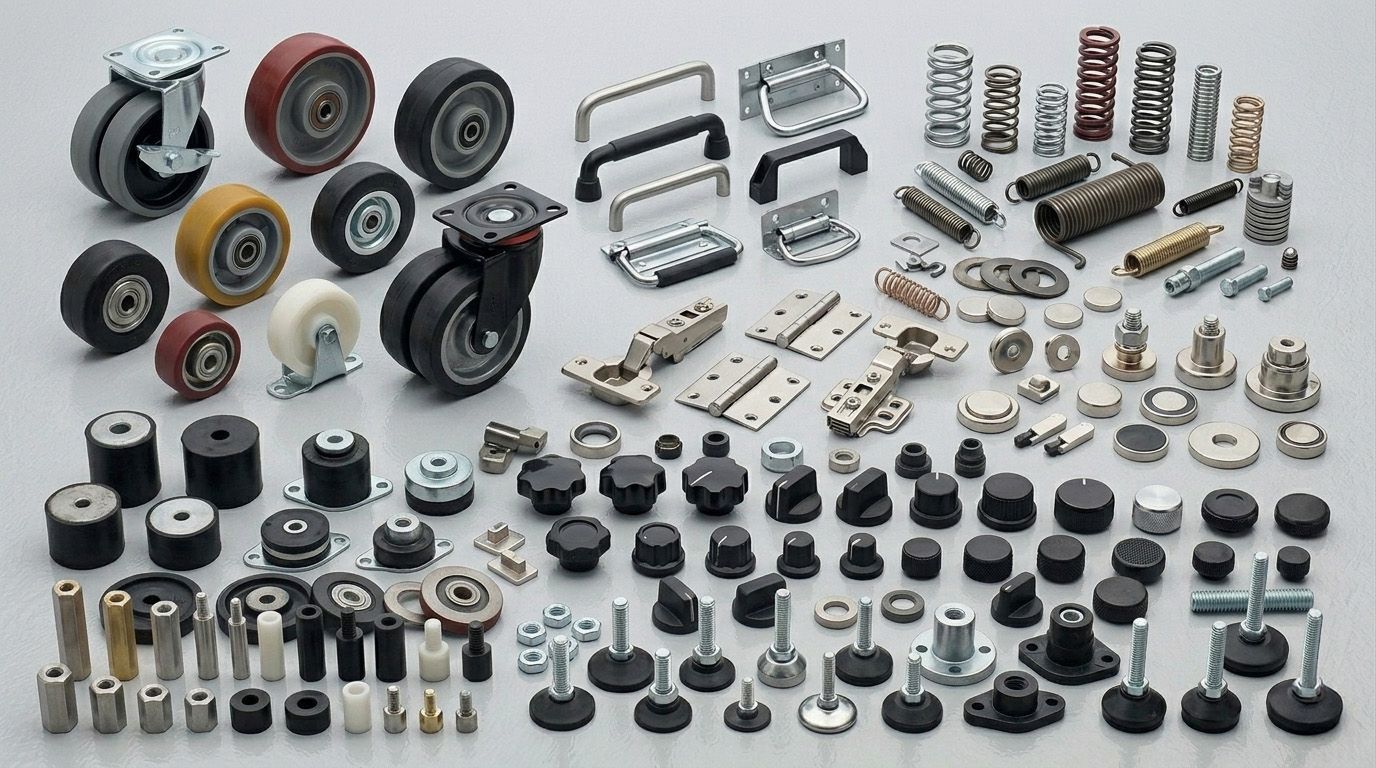 Ruote - Dispositivi di posizionamento - Magneti - Maniglie - Cerniere - Manopole - Piedini - Molle - Antivibranti - Distanziatori